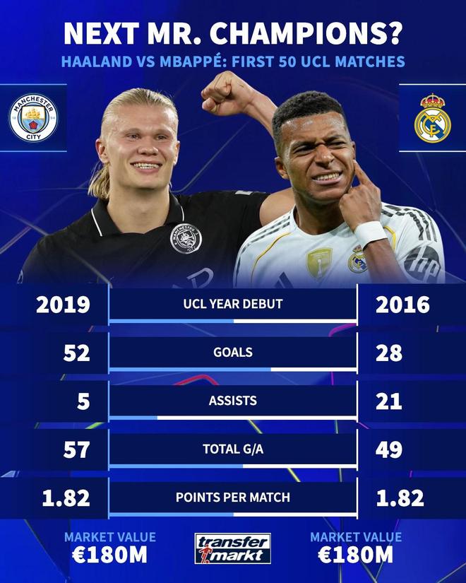 哈兰德与姆巴佩前50场欧冠数据对比:进球52-28,助攻5-21