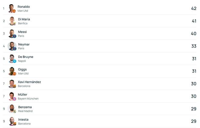 欧冠历史助攻榜:德布劳内进前5,C罗居首梅西第三