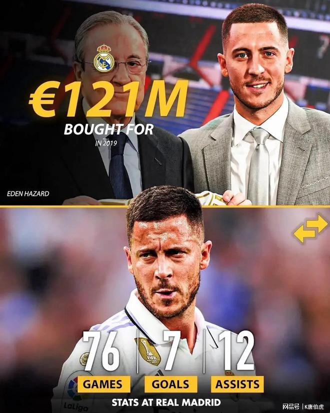 2019年夏,弗洛伦蒂诺急于找寻到C罗的接替者,为此他不惜花费了1.21亿的史上最贵转会费从英超切尔西带走了阿扎尔,这笔交易在当年可谓是惊动了全球。但是曾经的北伦敦球王在西甲却沦为了水货的代名词,4个赛季他仅仅出场了76次,贡献7球和12助攻。
