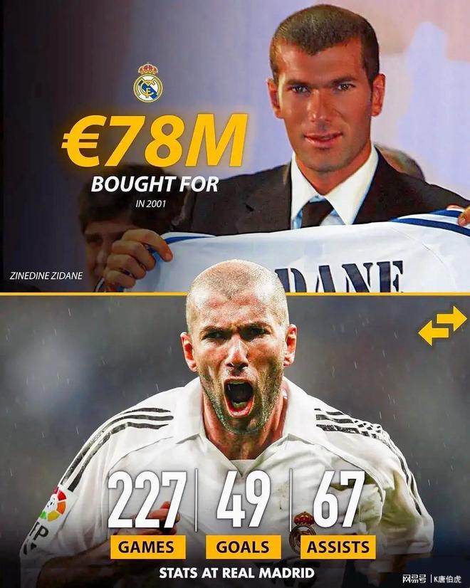 齐达内排在了皇马队史的第五名,2001年他从尤文图斯转会而来,转会费为7800万欧元,他留下了227场49球和67助攻的个人数据。作为当年银河战舰的绝对中场核心,齐祖算是非常值得。
