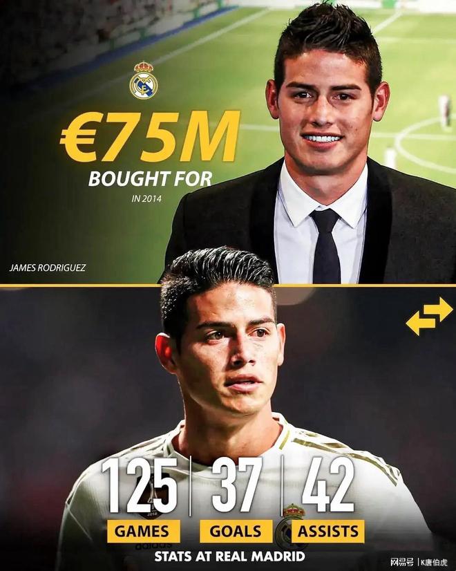7500万欧元的转会费换来的2014年世界杯金靴得主,怎么看都不会亏。然而J罗的职业生涯并没有朝着理想的方向发展,反而是每况愈下。在皇马时期他累计出场了127场比赛,进37球和42个助攻。