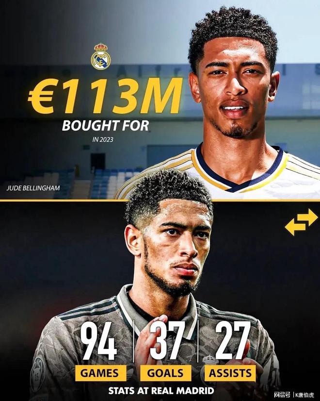 2023年贝林厄姆从多特蒙德转会至皇马的费用高达1.13亿,而今其身价已经涨至1.8亿欧元,关键的是他才22岁。