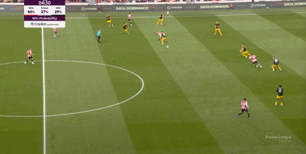 然而,约罗坐上替补席,德里赫特打到边中卫,中卫谁打?只能是马奎尔,于是在这场比赛,马奎尔移动不佳的毛病就出来了,这还是阿莫林已经判断到布伦特福德会打长传和高球,球队需要更多正面和高点防守能力的情况下。